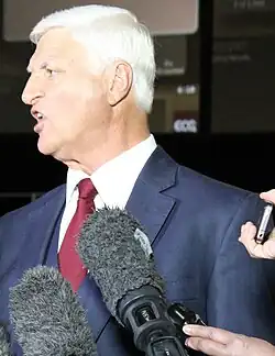 Katter returned to cabinet after only a month, following Cooper's successful ouster of Ahern in September 1989.[15] As mines minister, he was the subject of a no-confidence motion from the Queensland Chamber of Mines in November 1989, following his proposed changes to mining legislation that were perceived as favouring the interests of graziers over mining companies.[16] His term as a minister ended following the government's defeat at the 1989 state election.[17]