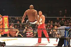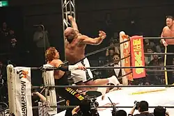 Sapp balanced his NJPW appearances with similar ventures in All Japan Pro Wrestling, where he intruded to challenge Bill Goldberg and Keiji Mutoh.[13] He first appeared in Wrestle-1, a copromotion between K-1 and AJPW, where he faced Mutoh's alter ego The Great Muta in November 2002. Sapp defeated him after pinning him with a diving headbutt.[14] He returned to the event in January 2003, where he wrestled his kickboxing rival Ernesto Hoost, yet this time Sapp lost after Hoost's cornerman Johann Vos intervened in the bout.[14]