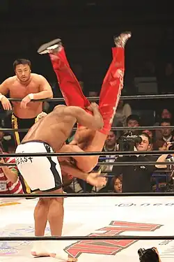 In 2002, riding his success in K-1, Sapp made his professional wrestling debut for New Japan Pro-Wrestling (NJPW). Introduced as a member of chairman Antonio Inoki's army of fighters, Sapp replaced an injured Yoshihiro Takayama in his October 14 match against Manabu Nakanishi. The two exchanged taunts and attacks on the weeks leading to the match, with Sapp ultimately winning after executing his finishing move, the Beast Bomb,[11] on the ringside, where he left Nakanishi to be counted out.[12] This victory led to many other wrestlers to suggest to take their chance against Sapp, among them Yuji Nagata and Takayama himself, but the American refrained from participating.[12]