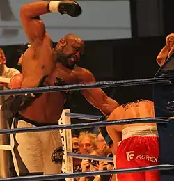 His greatest in-ring success, though, would come in his match over K-1 legend Ernesto Hoost. They first met at the K-1 World Grand Prix 2002 Final Elimination on October 5, 2002, where Sapp replaced an injured Cro Cop in his bout against Hoost.[35] The latter was expected to win thanks to his experience and technical superiority despite being outweighed by over 100 pounds, but Sapp claimed he would not need more than the first round to defeat Hoost, thus setting up an anticipated matchup.[12] Once the fight came around, all while under a television viewership of 19.8%,[12] Sapp surprised the crowd when he started dominating Hoost effectively through his already known charging strategy. By pushing Hoost against the ring's corners and unloading punches there with all of his strength, Sapp controlled the entire the first round, and still landed controversially three more punches after the bell sounded.[36] After the round, the ring doctor declared Hoost was unable to continue due to cuts, and Sapp was ultimately deemed winner while Hoost collapsed visibly in his corner, fulfilling his previous prediction.[37]