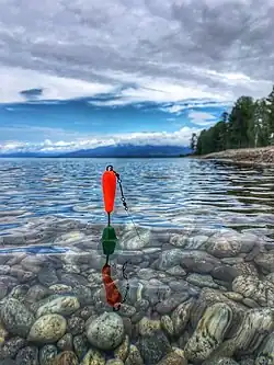 The float is used to enable the angler to cast out a bait away from the shore or boat while maintaining a reference point to where the bait is unlike bottom or leger fishing. The angler will select an appropriate float after taking into account the strength of the current (if any), the wind speed, the size of the bait he or she is using, the depth the angler wishes to present that bait at and the distance the bait is to be cast.[1] Usually, the line between the float and hook will have small weights attached, ensuring that the float sits vertically in the water with only a small brightly coloured tip remaining visible. The rest of the float is usually finished in a dull neutral colour to render it as inconspicuous as possible to the fish. Each float style is designed to be used in certain types of conditions such as slow or fast rivers, windy or still water or small confined waters such as canals.