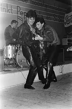 Vince dressed up for the occasion in his black leather gear and added a chain around his neck with a Joan of Arc medallion. He gave such an extraordinary performance at the sound check that even the band was amazed, and the organizers decided to put Vince Taylor and his Playboys at the top of the Bill for both shows. As a result of Vince's exciting performance and his interaction with the band at those two shows Eddie Barclay signed the group to a six-year record deal on the Barclay label, with Bobbie Woodman changing his name to Bobbie Clarke.