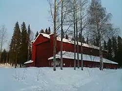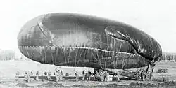 Both internal and external communication systems as well as means of reconnaissance were needed, both directed by the commandant located in the headquarters building. The building—finished in 1910—had three floors, the upper two functioned as home and workplace for the commandant and the chief of staff, while the ground floor had extra thick walls and functioned as the command post for the fortress.[74] A large field telephone network was built, connecting all forts with the headquarters. Liaison with higher commands was at first maintained by regular post, telegraph and telephone. The fortress' radio station was finished by 1914, originally for the Swedish Navy,[81] and was located south of Degerberget on a bog now known as the "Radio Mire" (Radiomyren). The first Swedish radio broadcasts were sent from this building.[75] The fortress also had homing pigeons for sending messages. At the end of the Second World War, around 280 such pigeons were stationed in Boden. The pigeons were part of the balloon department whose main task was to operate the balloon of the garrison. For this, the Balloon Hangar with inner measurements of 35×10×10 metres (115×33×33 ft) was built near the radio station. More than fifty men were attached to the department, of whom two could follow the balloon up to its maximum height of 1,000 metres (3,300 ft), limited by the length of the wire connecting it to the ground. The hydrogen-filled balloon itself was of German make and measured 27 metres (89 ft) in length, had a diameter of around 7 metres (23 ft) and a total volume of 750 cubic metres (26,000 cu ft).[82]