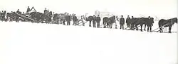 The cost of a single armoured turret for a 12 cm piece was almost 100,000 kronor—around $800,000 (as of 2011) in today's money[28]—and it could weigh as much as 100 tonnes (220,000 lb). It was delivered in parts to simplify transport, but the heaviest part still had a weight of 26 tonnes (57,000 lb). The parts were delivered by rail up to Boden and unloaded with the help of gantry cranes. As the roads of the time could not handle the weight during summer, transport had to wait until winter when the frost had hardened the ground. The turret parts were lifted onto sleighs drawn by 16–30 horses depending on the situation. The toughest stretch, up the mountain, was handled with the help of block and tackle, the ditch was crossed on temporarily built sturdy wooden bridges and the mounting of the turret was finished with cranes. A major part of the mounts for the turrets were completed by the end of 1905, despite the harsh winter working conditions, with temperatures falling below −40 °C (−40 °F) at times.[71] The peak workforce amounted to around 900 men,[72][73][note 8] but their numbers fluctuated, with the lowest number of active workers during the winter months. The first artillery test firing was conducted on 15 January 1907 when the guns at Gammelängsberget fired their first rounds,[69] and all five forts "were in a defensible state" by 1908.[74]