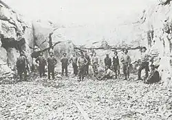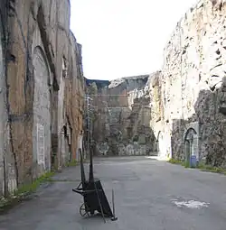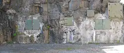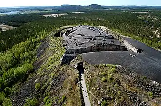 All work on the large masses of bedrock was conducted by hand, without any help of powered machines, as the first power station in Boden was not constructed until almost ten years later in 1909.[61] The first work that was done at the site was to create a large ditch, 9–12 metres (30–39 ft) wide and with a depth of 6 metres (20 ft) or more, that would surround the core of the fort. Creating patrol trenches and placements for the turrets on the top of the forts was also work done early on. The teams of workers would first bore down in the bedrock using pinch bars and sledgehammers, then use black powder to blast the rock into manageable pieces which could be transported away from the site, using wheelbarrows, horse-drawn carriages and in some cases Decauville railways. When the ditch, or parts of it, had been completed, work started on the inner part of the fort by boring horizontally from the bottom of the ditch into the mountain itself. This work was a lot harder—the cost for each cubic metre of blasted tunnel was five times the cost of a cubic metre of blasted ditch—both due to the confined space in the tunnels and the risk of damaging the bedrock. The use of black powder instead of dynamite reduced the risk of bedrock damage, but it also increased the time needed to complete the tunnels.[65] All in all, the amount of bedrock bored, blasted, loaded and transported away from the forts has been estimated to be around 300,000 cubic metres (11,000,000 cu ft).[66][67][note 7]