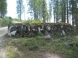 The main fortifications for infantry consisted of 44 concrete bunkers, 23 dugouts and 26 fortified observation posts.[76] The concrete bunkers (infanteriskansar, redoubts) were long and narrow. The longest, Abramsskansen, was 155 metres (509 ft) long and had room for 160 men and four machine guns, but most had room for less than 80 men—usually a rifle platoon reinforced with a machine gun section and an anti-tank section.[77] Due to their length, their curved shapes following the mountain sides, and other characteristics, the bunkers were popularly referred to as "sausages" (korvar). The construction of these started in 1911. Many officers still considered the fortress to have inadequate and too few fortifications for the infantry, and one officer compared the fortress to "a shoe, which is too large for the foot."[78] One million kronor was allocated in 1915 to fix that problem, and many minor fortifications were built during the First World War.