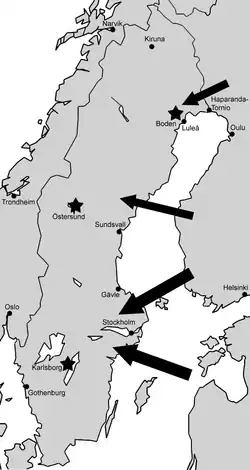 It was not until fifteen years later, when yet another committee—the Coastal Fortification Committee of 1839 (1839 års kustbefästningskommitté)—studied the defence of Norrland, that the Swedish Armed Forces started to focus a bit more on the northern provinces. This study however mainly presented plans for middle Norrland, and the provinces of Medelpad, Ångermanland and Jämtland.[14] Those provinces had a more significant role as it was there that the main roads of Sweden started to intersect with the road network of Norway, which at the time was allied with Sweden. The road network north of this area consisted of the large coastal road—the only major north–south road—from Haparanda and all the way through Norrland down to Gävle. All the other major roads exclusively ran southeast–northwest—following the run of the large rivers—before ending in wilderness and thus did not provide any route further west into Norway and on to the Atlantic coast.[10] The plans to strengthen Norrland by building a central fortress either on Frösön outside Östersund, or closer to the coast at Borgsjö outside Ånge, once again fell flat due to lack of money and lower priority compared to fortifications in southern Sweden.[13][15]