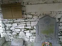 In October 1969, the Tones' tomb was bombed and damaged by the Ulster loyalist UVF.[10] In June 1975, the same group sought to derail a train at near Sallins carrying 250 Official IRA supporters to the annual commemoration, and murdered a witness to their attempt, a local farm labourer, Christopher Phelan.[11][12] In 2013, the Tone's headstone was replaced with a tomb of Irish limestone and, overlooking it on a church wall, a bronze relief portraying Tone in profile next to an excerpt from Pearse's 1915 eulogy.[10]