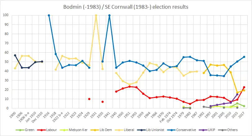 The boundary changes at the 1918 general election, which established what was now called Cornwall, Bodmin Division, and later Bodmin County Constituency, extended the constituency somewhat towards the centre of the county, taking in Callington and the surrounding district. These boundaries remained essentially unchanged for the remainder of the constituency's existence, except that Fowey was moved into the Truro constituency in 1974. As elsewhere in Cornwall, Labour never established a foothold in Bodmin, and the Liberals remained the main challengers to the Conservatives. The Conservatives held it continuously from 1945 to 1964, and at one point might have considered it a safe seat, but by the mid-1960s the Liberal revival had established it as a Liberal-Conservative marginal, which it remained until its abolition.