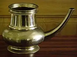 In West Bengal and parts of Bangladesh, the term bôdnā (Bengali: বদনা) describes spouted (teapot-like) vessels, and the vessels used for puja are called ghôt or ghôti, while lotā is used for cleansing mugs.[8] In Odisha, vessels without the spout is also known as lota, while spout vessel is known as Jeri, used for prayer rituals and serving liquor.[9][3] They are also known as Karwa, Jharis and Achaman Jharis (utensils with spouts) in Hindi Belt and Gujarat in northern and western India, used for prayer rituals.[10] It is also known as Mooku sombu and Pal Kindi used as milk feeder for babies in southern parts of India. In Nepal, it is known as Karuwa which is used for religious rituals, serving water and liquor.[4]