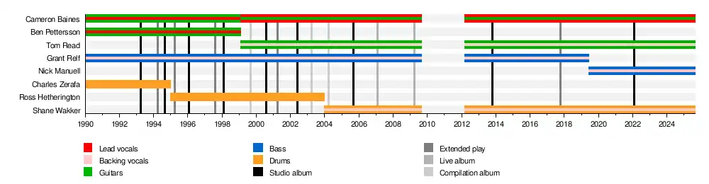 • Cameron Baines – guitars, lead vocals (1990–2009, 2012–present)