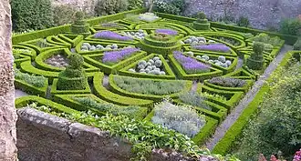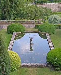Below and to the east is the larger walled rose garden; other prominent garden features are a rectangular lily pond and a series of smaller herb and perennial gardens below the pineapple stone cottage and to the north. A croquet lawn is found to the north of the main building. The gardens are designated Grade I on the Cadw/ICOMOS Register of Parks and Gardens of Special Historic Interest in Wales.[9]