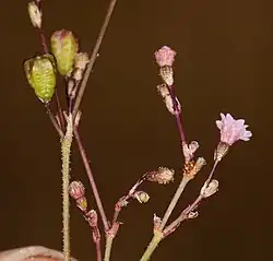 Boerhavia coulteri is a species of flowering plant in the four o'clock family known by the common name Coulter's spiderling. It is native to the southwestern United States and northern Mexico, particularly the desert areas. This is an annual herb producing an erect or creeping stem up to about 70 or 80 centimeters in maximum length. They are slightly hairy and have sticky resin glands toward the bases. The leaves are lance-shaped to somewhat triangular, pointed, sometimes wavy or rippled along the edges, and 5 centimeters in maximum length. Most of the leaves grow from the lower half of the plant. The sticky inflorescence is a small cluster of tiny white to pale pink flowers, each under two millimeters long. The fruit is an elliptical body a few millimeters in length with longitudinal ribs. The fruits are borne in small clusters.