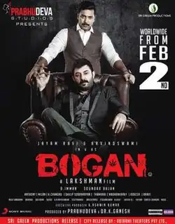 Bogan (transl. Hedonist / Pleasure seeker) is a 2017 Indian Tamil-language supernatural action thriller film written and directed by Lakshman and produced by Prabhu Deva and Ganesh.[2] The film stars Aravind Swamy and Ravi Mohan (credited as Jayam Ravi) in titular roles, with Hansika Motwani, Akshara Gowda, Nassar, Ponvannan and Naren in supporting roles. The story is about the body swapping of an honest police officer, Vikram (Ravi Mohan) and a powered thief, Aditya (Swami). Featuring music composed by D. Imman, the film began production during March 2016 and released on 2 February 2017 to positive reviews with praise for cast performances (especially Swami and Ravi's performance), story narration and Imman's music. However, the climax was criticised.