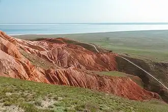 ![]() Big Bogdo Mountain slope, with salt lake in distance | |