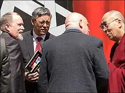 The 14th Dalai Lama with Tseten Samdup Chhoekyapa and 2 of the Bogside Artists in Maribor Slovenia at the unveiling of their mural painting in May 2012