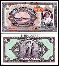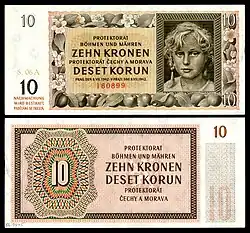 Czechoslovak banknotes for 1 koruna and 5 korun were stamped (and later printed) with "Protektorat Böhmen und Mähren" over "Protektorát Čechy a Morava," and subsequently issued in Bohemia and Moravia beginning on February 9, 1940.[8] These were followed by regular government issues of 1, 5, 50 and 100 korun in 1940,[9] 10 korun in 1942,[10] and 20 and 50 korun in 1944.[11] Nationalbank für Böhmen und Mähren in Prag (National Bank for Bohemia and Moravia in Prague) introduced 500 and 100 korun notes in 1942, followed in 1943 by overprinted Czechoslovak 5000 korun notes. In 1944, the National Bank issued regular 5000 korun notes.[11]