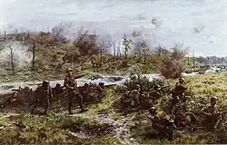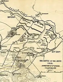 An hour later, at 0100 hours, the opening bombardment of Blücher-Yorck began, augmented with poison gas and described as 'of a violence and accuracy that in the opinion of the most seasoned soldiers far outdid any other barrage they were under'.[5] Sheltered as they were in dugouts deep underground, the Devons' casualties were light, although the gas caused some discomfort and inconvenience, and ammunition parties could not be sent out. At approximately 0345, the German infantry attack began using the recently developed Stormtroop tactic of advancing rapidly, probing for weak spots and avoiding pockets of resistance. The units in the front-line trenches, which had already suffered severely from the artillery bombardment, were rapidly infiltrated and overrun.[6] Soon the 8th Division's only cohesive unit of any size north of the river Aisne was the 2nd Devonshires.