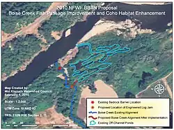 Access to Boise Creek for salmon has been blocked by a bedrock falls 13.5 feet high near the creekmouth (see figure) so the Mid Klamath Watershed Council proposed, in February 2010, creation of an engineered logjam to divert flows into historic side channels which would re-connect the creek to the Klamath River mainstem and bypass the falls. Before the logjam could be constructed, beaver coincidentally constructed a dam across Boise Creek at the proposed site, and numerous Coho salmon, Chinook salmon (Oncorhynchus tshawytscha) and Steelhead trout (Oncorhyncus mykiss) are now accessing the stream from the Klamath, opening several new miles of historic spawning habitat to the fish.[6]