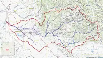 The Boise River is a 102-mile-long (164 km)[2] tributary of the Snake River in the Northwestern United States. It drains a rugged portion of the Sawtooth Range in southwestern Idaho northeast of Boise, as well as part of the western Snake River Plain. The watershed encompasses approximately 4,100 square miles (11,000 km2) of highly diverse habitats, including alpine canyons, forest, rangeland, agricultural lands, and urban areas.