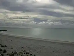 The lagoon water level is up to 1 meter (3.3 ft) higher than the surrounding ocean due to an influx of wind-driven waters over the windward ocean reef and the presence of only one narrow reef passage on the leeward side. Water cascades over the coral-covered rim and flats of the sloping leeward reef. A massive algal ridge lines the outer edge of the windward reef, while the south and west reefs are coral-covered narrow flats where landings can be made in quiet weather. A very small algal rim, 100–150 mm (4–6 in) high, on lagoon shores of the westernmost islets, on east-facing lagoon reef-fronts and on the windward edges of coral patches in the lagoon, may be a feature unique to Taongi. This rim is maintained by the constant flow of water over the reef flat.[3]