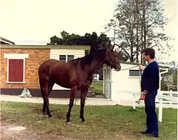 ![]() Bold Personality, whilst being held as an exhibit at the Mounted Police Unit, Oxley with Senior Constable Ian Johnston | |