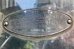Early Boles Aero trailers had two manufacturer data plates. One plate was mounted adjacent to the entry door, while a second data plate was located on the rear of the trailer, just above the license plate. The trailer's individual serial number was stamped on these data plates until 1952, after which the trailer model name was added in its place. From 1952 the serial numbers are found stamped on the frame. Hemmings magazine described the early Boles Aero trailers as both lightweight and aesthetically pleasing, remarking "some people count them among the most beautiful trailers ever made".[4]