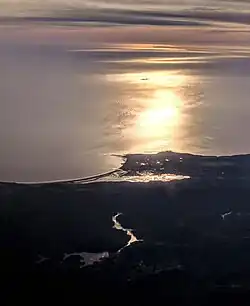 Bolinas, Bolinas Bay, Stinson Beach, Bolinas Lagoon, Farallon Islands, Alpine Lake, Bon Tempe Lake, aerial outlined by reflection of the afternoon sun