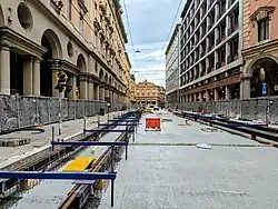 As of June 2022, the tender for the executive design and construction of tramway line 1 (red line) has been awarded: the whole line is expected to be operational by 2026.[8] Funding for construction of line 2 (green line) was approved by the Italian Ministry of Infrastructure and Transport in November 2021; activation is also expected by 2026.[9] A further segment of line 2 (blue line) was announced on 11 December 2021, with completion to be expected at a later date than the first two lines.[10] Construction of the first line started on 26 April 2023,[11][12] while construction of the second line started on 8 August 2024.[2]