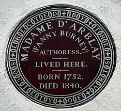 - Madame D'Arblay (pseudonym Fanny Burney), playwright, at No. 11, which marked by a plaque erected by the Society of Arts;