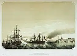 On 10 November 1851, the French Secretary of the Navy tasked Louis Dubourdieu with the execution of the action against Salé,[10] and five vessels were assigned to him in this regard: Henri IV (armed with 100 cannons and captained by Louis Henri de Gueydon), the Sané (14 cannons),[11] the Gomer (14 cannons),[12] the Narval (4 cannons),[13] and the Caton (6 cannons).[10][14][15] The fleet gathered in Cádiz on 19 November, and after being supplied with food and coal, sailed for Salé on 21 November.[14]