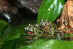 The Oriental fire-bellied toad (Bombina orientalis) is a small semiaquatic frog species found in northeastern Asia, where they primarily dwell in slow-moving bodies of water and temperate forests. Quite common throughout much of their range, these frogs have mild toxins that can be excreted through their skin, with their vibrant underbellies serving as a warning of this. While not a true toad, their green and black skin is covered in small tubercles, giving them a toadlike appearance. Their sounds, mainly produced by males during the mating season, are very unlike those of other frogs. While their population is in decline, their numbers are still high overall, with the International Union for Conservation of Nature (IUCN) rating them as a least-concern species. They are commonly kept as pets in land and water vivaria, as a relatively easy-to-care for species. They are also frequently used in scientific research, with their behavior, vocalizations, and learning skills all moderately studied.