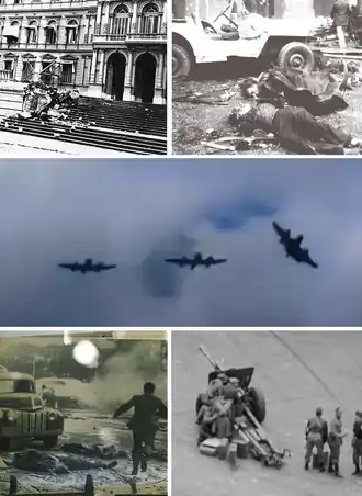 After heavy urban fighting, which included a false surrender incident, the besieged rebels finally opted for handing over the Ministry of the Navy to the Army units posted outside. Fire ceased at 17:20 local time. Between 9.5 and 13.8 tonnes of ordnance were dropped, killing between 150 and 364 people,[21] mostly civilians, and injuring over 800. Nine members of the Mounted Grenadiers Presidential Guard[1] and five police officers were killed in action.[22]