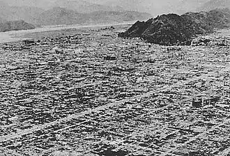 On June 19, 1945, 137 B-29 bombers from the USAAF 314th Bombardment Wing launched a major firebombing attack on the central part of the city.[4] The bombers attacked in two waves from east and west, so as to trap the population within the center of the city, between the mountains and the sea, dropping 13,211 incendiary bombs. The resultant firestorm destroyed most of the city.[5] Shizuoka civil defense measures were crude at best and the city had almost no antiaircraft batteries.[6] Air raid shelters consisted of a hole in the ground next to wooden houses with a wooden roof covered with a thin layer of soil and clay. Due to the high ground water levels in the area, these shelters were shallow, and many people were burned alive in the firestorm.[3] The estimated civilian casualties in the June 19 raid were 1,952 people killed, an estimated 12,000 were severely injured, and 26,891 homes were destroyed. A year after the war, the United States Army Air Forces's Strategic Bombing Survey (Pacific War) reported that 66.1 percent of the city had been totally destroyed.[7]