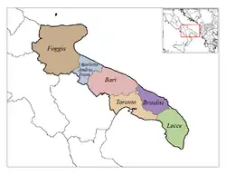 Bombino bianco is a permitted grape variety in several DOC zones including the Biferno DOC in the province of Campobasso and Pentro di Isernia DOC in the Isernia province of Molise, Bianco Capena, Cerveteri, Cesanese di Olevano Romano, Frascati, and Marino DOCs in the province of Rome in Lazio, the Genazzano DOC that includes both the Rome and Frosinone provinces of Lazio, the Colli Romagna Centrale and Pagadebit di Romagna DOC that are produced in both the Forlì-Cesena and Ravenna provinces of Emilia-Romagna, the Gravina DOC from the Bari province in Apulia, Leverano DOC from the province of Lecce, Martina Franca and Locorotondo DOCs that extends into both the Bari and Brindisi provinces, and the Cacc'e mmitte di Lucera and San Severo DOC in the Foggia province of Apulia.[7][6]
