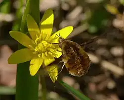 Bombylius major has several host species, including the brood of solitary wasps and bees, particularly digging bees such as Andrena. Egg deposition takes place by the female hovering above the entrance of a host insect nest, usually a solitary bee, and throwing down her eggs using a flicking movement.[10] The larvae are hypermetamorphic parasitoids which then feed on the food stored, as well as the young solitary bees or wasps. If the female is unable to flick her eggs near the nest, she plants them on flowers visited by the host insects. The developing larvae then make their way to the host nest or attach themselves to the bees or wasps to then be carried to the nest.[10]