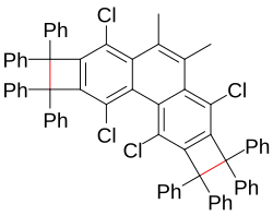 Another notable compound with an extraordinary C-C bond length is tricyclobutabenzene, in which a bond length of 160 pm is reported. Longest C-C bond within the cyclobutabenzene category is 174 pm based on X-ray crystallography.[3] In this type of compound the cyclobutane ring would force 90° angles on the carbon atoms connected to the benzene ring where they ordinarily have angles of 120°.
