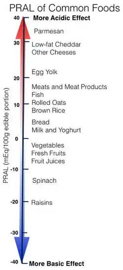 - ^ a b Remer T, Manz F (July 1995). "Potential renal acid load of foods and its influence on urine pH". Journal of the American Dietetic Association. 95 (7): 791–797. doi:10.1016/S0002-8223(95)00219-7. PMID 7797810.