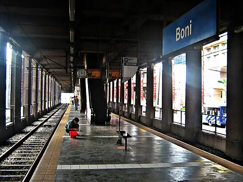 Boni station is an at-grade Metro Rail Transit (MRT) station located on the MRT Line 3 (MRT-3) system in Mandaluyong. It is named so due to its proximity to Boni Avenue, which is in turn named after the nickname of Bonifacio Javier, a World War II guerrilla leader and former mayor of Mandaluyong.[1] It has several restaurants and shops that surround the station, including a public market located across the train station.