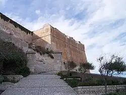 The city and its fortifications also extend for some distance along the cliff-tops, which are at about 70 meters (230 ft) elevation. The cliffs have been undercut by the ocean so that the buildings, which have been placed on the very lip of the precipice, appear to overhang it. The appearance from the sea is of a white city gleaming in the sun and suspended over the rough waters below.