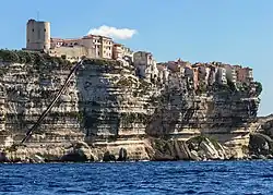 Bonifacio (/ˌboʊniˈfɑːtʃoʊ/ BOH-nee-FAH-choh,[3] Italian: [boniˈfaːtʃo], French: [bɔnifasjo]; Corsican: Bunifaziu [buniˈfatsju], Bonifaziu [bɔniˈfatsju], or Bonifaciu [bɔniˈfatʃu]; Bonifacino: Bunifazziu; Gallurese: Bunifaciu) is a commune in the southern tip of the island of Corsica, in the French department of Corse-du-Sud.