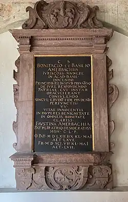 After Amerbach's father-in-law Leonhard Fuchs died in 1546 in Neuenburg, Bonifacius Amerbach became the head of the entire Amerbach and Fuchs families.[35] He died in April 1562 and was buried at the Monastery St. Margarethental in Basel.[2]