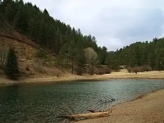 The area is now a part of the Lincoln National Forest, but in the late 19th century, the Southern Pacific Railroad owned most of the water rights in the area. In 1907 the railroad built a small dam in South Fork Canyon, upstream from the current dam. From that dam they extended a wooden pipeline 132 miles (212 km) to Pastura, New Mexico to provide water for the steam trains of the era.[1] The remnants of the original dam and pieces of the wooden pipeline are still visible to hikers along the trail in South Fork Canyon.
