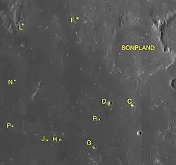 By convention these features are identified on lunar maps by placing the letter on the side of the crater midpoint that is closest to Bonpland.