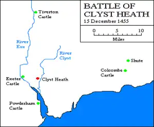 During the same period, Devon, "in warlike fashion and like an insurrection"[31] also besieged Powderham Castle, which belonged to his distant cousin and Bonville ally, Sir Philip Courtenay; the latter resisted, and Bonville came to his assistance. Prior to doing this, however, he raided the Earl of Devon's house at Colcombe Castle and proceeded to ransack it. Bonville attempted to lift the siege at Powderham on 19 November, but was repulsed by Devon, and lost two men in the fight,[34] which may have involved up to a thousand men.[35] Meanwhile, Devon continued his attempts to persuade the city of Exeter to raise a force on his behalf – which they refused to do – before leaving Exeter.[34] as Bonville approached, on his way to Powderham. On 15 December 1455, the two forces met at Clyst Heath, just southwest of Exeter.[36]