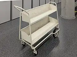 A book truck, book trolley, or book cart is a small wheeled vehicle, typically with two or three shelves, used in libraries to move books.[1] It was patented in the United States by David Edgar Hunter in 1899.[2]