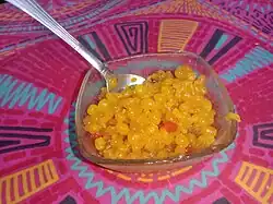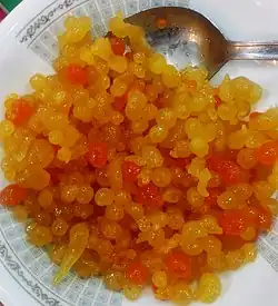 Boondi is an Indian snack made from fried chickpea flour. It is either eaten as a savoury snack or sweetened as a dessert.[1]