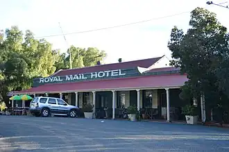 By late 1860 a public house was constructed near the well by Messrs. Roberts and Roby, businessmen from Deniliquin, which became known as the Pine Ridge Inn (or Hotel).[6] With the establishment of a coach route between Deniliquin and Hay the public-house at Pine Ridge became a coach change-station for horses. Early recorded publicans were Chapman (1862) and William Kiely (May 1864).[7] By November 1864 Samuel Porter had purchased the Pine Ridge Hotel.[8] He carried out extensive repairs to the establishment which had "for some time been in a most dilapidated state" and constructed a dam on nearby Box Creek. In July 1866 Porter was granted a license for the Pine Ridge Hotel.[9]