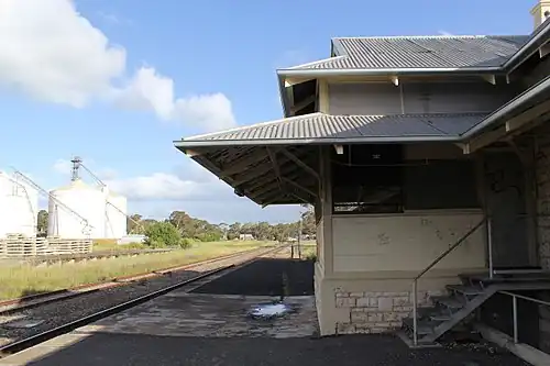 The railway arrived in Bordertown on 22 September 1881 when the Kingston SE to Narracoorte line was extended north.[1] It was connected via rail to Adelaide in 1886 with the arrival of the Adelaide-Wolseley line. The current station was built in 1914.[2]
