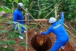 Especially in developing countries many boreholes are still dug by hand. The digging begins with manual labor using basic tools such as shovels, picks, and crowbars. Workers excavate the soil layer by layer, often using a circular motion to create a well-shaped hole. The process is slow and demanding, requiring teamwork and coordination. To prevent the walls from collapsing and to ensure water quality, the borehole is lined with materials like bricks, stones, or concrete rings. This reinforcement maintains the integrity of the borehole's structure and helps to prevent contamination. A concrete platform or slab may be installed at the bottom to prevent sediment from entering the water. The top of the borehole is capped to protect it from debris and contamination.[14]